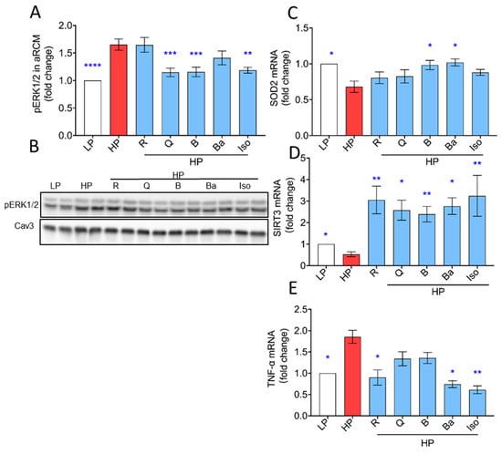 TCM compounds increase expression of antioxidant genes and prevent increased expression of inflammatory markers in lipid-overexposed cardiomyocytes. In (A–E) panels, aRCMs were cultured for 24 h under various conditions, being low palmitate (LP, basal condition for aRCMs), high palmitate (HP, palmitate/BSA ratio 3:1), and HP supplemented with Resveratrol (R), Quercetin (Q), Berberine (B), Baicalein (Ba), or Isorhamnetin (Iso). After 24 h, cells were lysed and either used for Western blotting or qPCR. (A,B). Phosphorylation levels of ERK1/2(Thr202/Thr204) in aRCM (n = 5) were detected by Western blotting. For quantitative comparison of p-ERK1/2 among the different conditions, these signals were normalized against the respective signal of caveolin-3 protein content (loading control). Representative Western blots of p-ERK1/2 and Cav-3 are displayed. (C–E). The mRNA levels of SOD2, SIRT3, and TNF-α were detected by qPCR in aRCMs. Transcripts were normalized to actin (n = 4). White columns represent basal condition, red columns represent HP condition, blue columns represent prevention of TCM compounds. Bar values are means ± SEM. One-way ANOVA followed by Duncan’s post hoc tests (among the groups, i.e., different culturing conditions) was used for the comparison. * p < 0.05 was considered statically significant. (* p < 0.05, ** p < 0.01, *** p < 0.001, **** p < 0.0001).