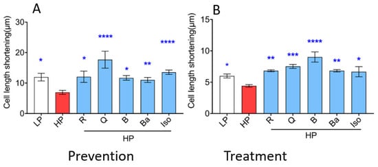 TCM compounds not only prevent but also ameliorate cardiac contractile dysfunction in lipid-overexposed cardiomyocytes. In panel (A) (Prevention): aRCM were cultured for 24 h under various conditions, being low palmitate (LP, basal condition for aRCMs), high palmitate (HP, palmitate/BSA ratio 3:1), or HP supplemented with Resveratrol (R), Quercetin (Q), Berberine (B), Baicalein (Ba), or Isorhamnetin (Iso) (n = 6). In panel (B) (Treatment): aRCMs were incubated for the first 24 h in either low palmitate (LP, basal condition for aRCMs) or high palmitate (HP, palmitate/BSA ratio 3:1). Then, the medium was replaced by either low palmitate (LP, basal condition for aRCMs), high palmitate (HP, palmitate/BSA ratio 3:1), or HP supplemented with Resveratrol (R), Quercetin (Q), Berberine (B), Baicalein (Ba), or Isorhamnetin (Iso) for another 24 h (n = 6). Subsequently, contractile properties of aRCMs were assessed at 1 Hz, 30 v, and 5 ms using a video-based cell geometry system to measure sarcomere shortening dynamics during electrostimulation. An example of contraction recordings is in the Supplementary Materials. White columns represent basal condition, red columns represent HP condition, blue columns represent prevention of treatment of TCM compounds Bar values are means ± SEM. One-way ANOVA followed by Duncan’s post hoc tests (among the groups, i.e., different culturing conditions) was used for the comparison. * p < 0.05 was considered statically significant. (* p < 0.05, ** p < 0.01, *** p < 0.001, **** p < 0.0001).