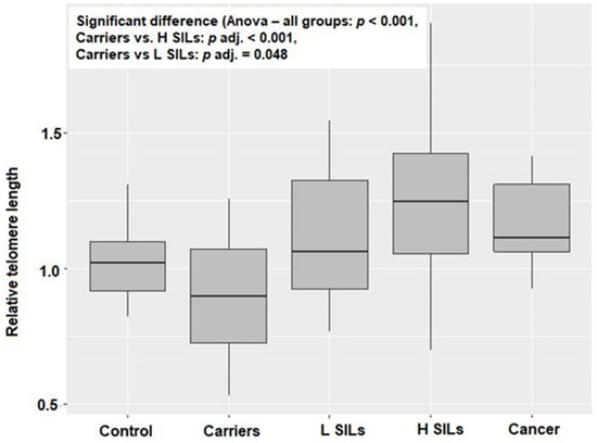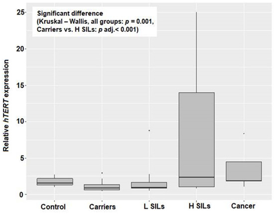 RTL and relative hTERT expression were measured for groups of patients. Significant differences between histopathology groups were confirmed for both relative telomere length (RTL) and relative hTERT expression (p < 0.001 and p = 0.001, respectively; Table 1, Figure 1 and Figure 2). Based on pairwise comparisons, a significant difference in RTL was identified between carriers and H SILs (p adj < 0.001), as well as between carriers and L SILs (p adj = 0.048), and in both cases RTL was lower among carriers. A statistically significant difference in relative hTERT expression was also observed between carriers and the H SILs group (p adj < 0.001).