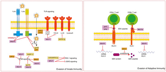 In response to the robust host immune response, EBV has developed various strategies to evade the host’s innate and adaptive immunity. A significant portion of EBV-encoded proteins and non-coding RNAs are dedicated to facilitating immune evasion [131,132,133]. To establish infection and maintain long-term coexistence with the body, EBV manages to modulate the corresponding signaling pathways to minimize their antiviral activity. For the innate immune response, since PRR signaling leads to activation of the transcription factors interferon regulatory factors (IRF) 3 and 7 [134] or NFκB [135], creating an environment that is inhospitable to the virus, EBV can inhibit PRR signaling to restrain the activation of IRF and NF-κB, such as TLR signaling, cGAS-STING signaling, and RIG-I-MAVS signaling. Additionally, EBV can directly suppress the expression of IRF or the activation of the NF-κB pathway to evade innate immunity. By regulating specific molecules, EBV can inhibit or block one or more of these pathways, helping the virus escape innate immunity.
