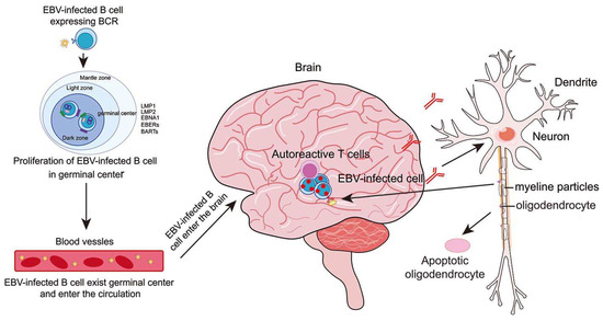 The mechanisms of EBV in the pathogenesis of multiple sclerosis. After EBV infection with B cells, B cells enter the germinal center program to proliferate. After proliferation, infected B cells leave the lymph nodes and enter the bloodstream. The infected cells follow the circulation into the brain and stay in the brain cells. Autoreactive T cells in the CNS are activated by contact with infected B cells. In addition, dendritic cells that present and release viral antigens also contribute to activation. The low efficiency of removing infected B cells results in their accumulation in the CNS. EBV-infected B cells in the CNS produce autoantibodies that act on the myelin sheath, leading to the damage of the myelin sheath and releasing myelin sheath and oligodendrocyte debris. EBV-infected B cells also act as powerful antigen-presenting cells to stimulate autoreactive T cells to recognize and attack myelin, contributing to inflammation of the CNS. The B cells and T cells in the CNS play their function to damage other cells and cause autoimmune diseases.