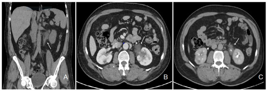 Abdominal CT scan images showing the pseudotumor of the left renal pelvis. Legend: coronal section, non-contrast phase (A); transversal section, nephrographic phase (B); transversal section, excretory phase (C); left ureteral tumor (white arrow).