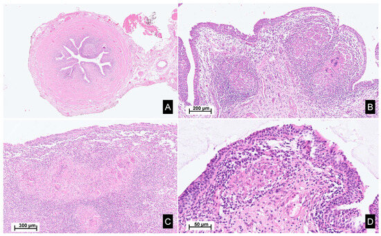 Histopathological images of the surgical material. Legend: Hematoxylin and eosin staining, sections from the ureter (A,B), renal pelvis and calyxes (C), and bladder (D), reveal poorly demarcated, non-necrotizing epithelioid granulomas within the lamina propria, accompanied by Langhans-type giant cells. These granulomas are associated with a mixed inflammatory infiltrate, rich in lymphocytes, plasma cells and eosinophils. Focally, a scarring fibrous reaction is observed.