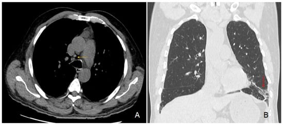 Chest CT scan images. Legend: transversal section (A) showing hilar lymphadenopathies (yellow arrow); coronal section (B) showing fibrous reticulations with bronchiolectasis of the pulmonary base (red arrow).