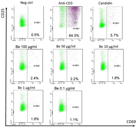 Blood beryllium lymphocyte proliferation test. Legend: PBMCs are incubated with negative (cell culture medium) and positive controls (anti-CD3 and Candidin), and with decreasing beryllium concentrations for 72 h. Activated CD69+ CD25+ CD4+ T cells are detected by cytometry after stimulation and stimulation index are calculated (% activated CD4+ T cells after stimulation/% activated CD4+ T cells in negative control).