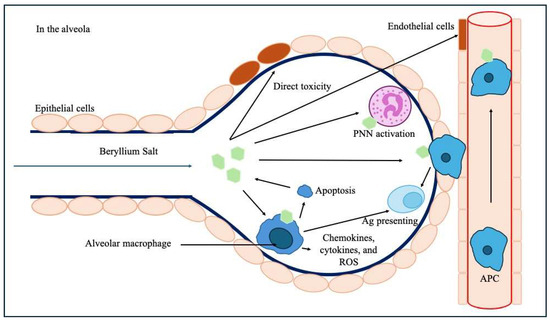 Pathophysiological mechanisms of Be-induced toxicity upon the alveolar–capillary barrier and subsequent immunological processes. Legend: Ag: antigen, APC: antigen-presenting cells, PNN: polynuclear neutrophil, ROS: reactive oxidative species.