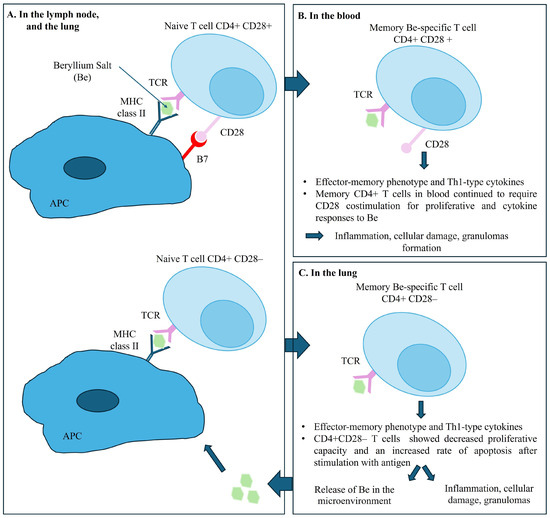 Pathogenesis of chronic beryllium disease. Legend: Panel (A) shows the immune response in the lymph nodes and the lungs, illustrating the interaction between naive T cells and APC upon engagement of T cell receptors (TCR) expressed on T cells with their cognate MHC II–peptide complex expressed on antigen-presenting cells (APC), with and without CD28 costimulation. Panel (B) shows the Memory CD4+ T cells in blood requiring CD28 costimulation for proliferative and cytokine responses to Be salt. Panel (C) shows the immune response in the lungs. Beryllium-specific CD4+ CD28- T cell expressing an effector-memory phenotype and the releasing of Th1-type cytokines when stimulated with Be salt.