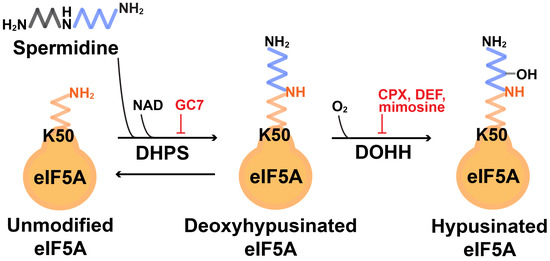 - Park, M.H.; Wolff, E.C. Hypusine, a polyamine-derived amino acid critical for eukaryotic translation. J. Biol. Chem. 2018, 293, 18710–18718. [Google Scholar] [CrossRef] [PubMed]
