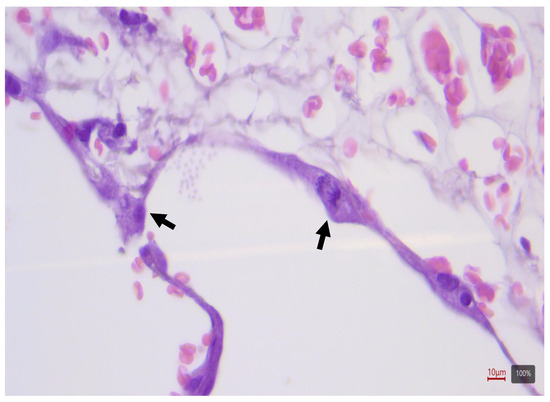 Representative image of 3-micron-thick paraffin sections stained with hematoxylin and eosin after 72 h of culture with activated type 2 pneumocytes and mitoses indicated by black arrows. Scale bar 10 μm, magnificence 80×.
