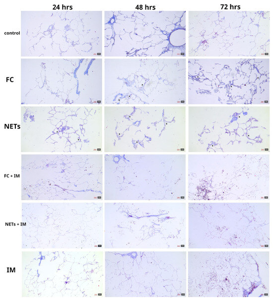 Representative microphotographs showing lung PCLSs treated with different stimuli and imatinib at different time points. PCLS incubation, FC, NETs, or IM treatment did not affect cell and tissue viability. A slight increase in interstitial connective tissue and cellularity was observed with both treatments at 24 to 72 h (thickened alveolar septa highlighted with X mark), while IM treatment appeared to prevent thickening of alveolar septa. IM alone did not affect lung architecture (Masson trichrome stain, 4× magnification, scale bar 10 μm).
