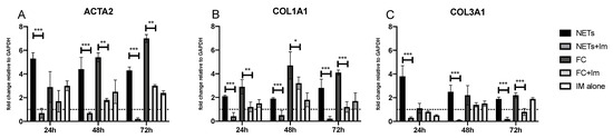 Quantitative analyses of ACTA2 (A), COL1A1 (B) and COL3A1 (C) in PCLSs of ex vivo model using NETs or FC as stimuli and then treated with imatinib. The results are presented as the mean ± SD of the fold change relative to GAPDH from the lung cancer resection tissue of ten patients, incubated for 24, 48, or 72 h. The data are referenced to untreated control PCLSs, represented in the figure as the dashed line. *** p < 0.0001; ** p < 0.001; * p < 0.01.