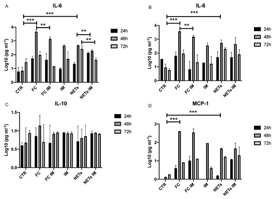 Cytokine release by PCLS. IL-6 (A), IL-8 (B), IL-10 (C) and MCP-1 (D) levels in the supernatant of PCLS cultures. Cytokine concentrations are expressed as Log10 (pg mL−1). The results are shown as mean ± SD of values from three determinations. *** p < 0.0001; ** p < 0.001.