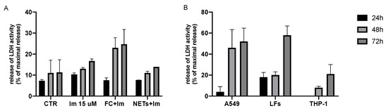 PCLS supernatants were collected from 24 h to 72 h in order to better understand the mechanisms underlying the increase in ACTA2, COL1A1 and COL3A1 expression levels in unstimulated PCLSs treated with imatinib at 15 μM. Metabolic assessment was performed by determining LDH release and it was confirmed that no major cell death occurred up to 72 h (Figure 5A). Imatinib, even with the combination of a stimulus, whether NETs or FC, did not induce an increase in cytotoxicity. While a greater increase in release was observed in the presence of FC + Im at 48 h and 72 h, it did not exceed 25% of maximal release.