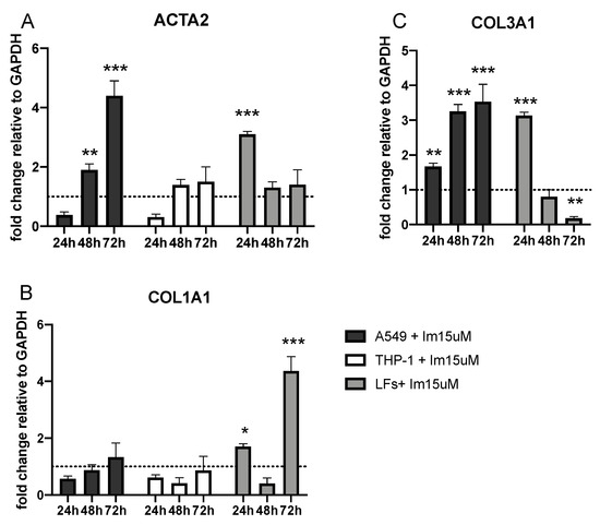 Quantitative analyses of ACTA2 (A), COL1A1 (B) and COL3A1 (C) in A549, THP-1, and LFs treated with imatinib. The results are shown as mean ± SD of the fold change relative to GAPDH from three independent experiments after 24–48–72 h of incubation. The data are referenced to untreated control, represented in the figure as the dashed line. *** p < 0.0001; ** p < 0.001; * p < 0.01.