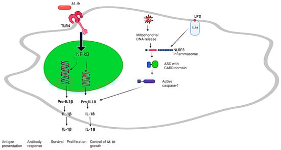 M. tb PAMPs, PRRs initiate signaling cascades that activate downstream pathways, including nuclear factor kappa B (NF-κB) and mitogen-activated protein kinases (MAPKs), resulting in the transcriptional upregulation of proinflammatory cytokines, including IL1β and IL18, and the expression of tumor necrosis factor alpha (TNF-α) [