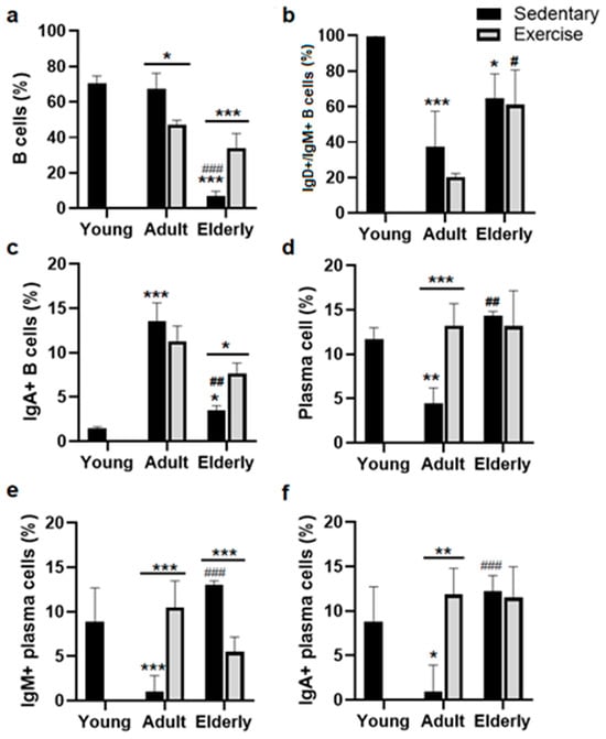 Lymphoid sub-populations in lamina propria in the small intestine of sedentary and exercised mice at different ages. Data represent the mean and standard deviation of (a) total B cells; (b) membrane IgM+/IgD+ B cells; (c) membrane IgA+ B cells; (d) plasma cells; (e) cytoplasmic IgM+ plasma cells; (f) cytoplasmic IgA+ plasma cells. (*) bar versus young mice; (#) bar versus respective adult control; asterisks upon line on the bars versus respective sedentary control. * p < 0.05, ** p < 0.01, and *** p < 0.001; # p < 0.05, ## p < 0.01, and ### p < 0.001.
