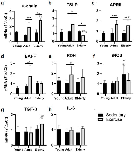 Gene expression of factors related to the production of IgA in lamina propria in the small intestine in sedentary or exercise mice at different ages. Data represent the mean and standard deviation of (a) α-chain, (b) Thymic Stromal Lymphopoietin (TSLP), (c) A Proliferation-Inducing Ligand (APRIL), (d) B cell activating factor (BAFF), (e) retinol dehydrogenase (RDH), (f) inducible nitric oxide synthase (iNOS), (g) transforming growth factor β (TGF-β), (h) interleukin (IL)-6. (*) bar versus respective young mice; (#) bar versus respective adult control; asterisks upon a line on the bars versus respective sedentary control. * p < 0.05, ** p < 0.01, and *** p < 0.001; # p < 0.05, ## p < 0.01, ### p < 0.001.
