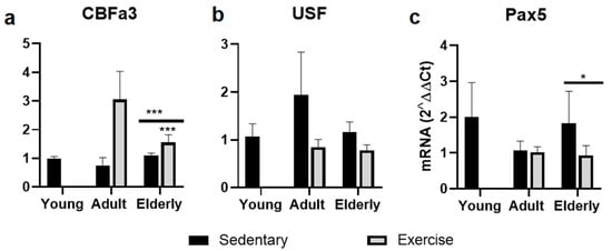 Gene expression of transcription factors involved in B cell development and differentiation impacting IgA production. Data represent the mean and standard deviation of (a) Core-Binding Factor Alpha 3 (CBFa3/RUNX-3), (b) Upstream Stimulatory Factor-1 (USF), and (c) paired box5 (Pax5). (*) bar versus young mice or asterisks upon line on the bars versus respective sedentary control. * p < 0.05 and *** p < 0.001.