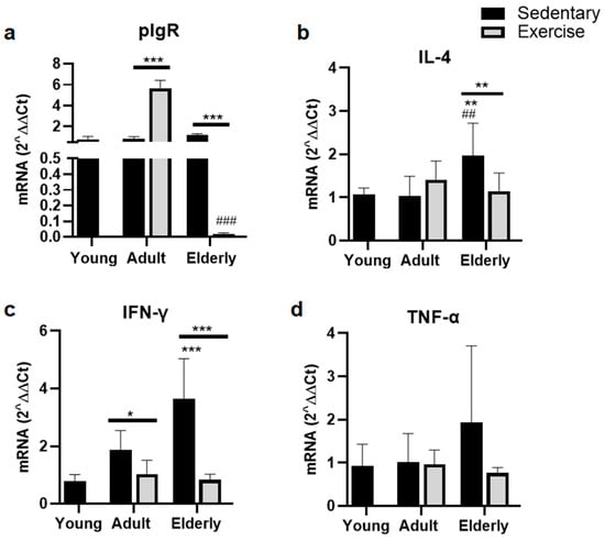 Gene expression of the polymeric immunoglobulin receptor in epithelial cells (a) and cytokines related with its expression in lamina propria (b,c) in the small intestine in sedentary mice or exercise mice at different ages. Data represent the mean and standard deviation of (a) pIgR, (b) interleukin (IL)-4, (c) interferon-γ (IFN)-γ, and (d) tumor necrosis factor-α (TNF)-α. (*) bar versus respective young mice; (#) bar versus respective adult control; asterisks upon line on the bars versus respective sedentary control. * p < 0.05, ** p < 0.01, and *** p < 0.001; ## p < 0.01 and ### p < 0.001.