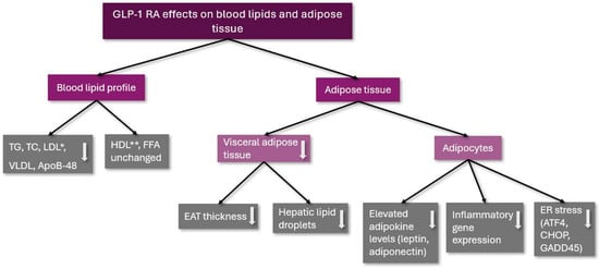 The effects of GLP-1 RA on blood lipids and adipose tissue. TG: triglycerides; TC: total cholesterol; LDL: low-density lipoprotein cholesterol; VLDL: very low-density lipoprotein cholesterol; ApoB-48: Apolipoprotein B-48; HDL: high-density lipoprotein cholesterol; FFA: free fatty acids; EAT: epicardial adipose tissue; ER: endoplasmic reticulum; ATF4: activating transcription factor 4; CHOP: C/EBP homologous protein (CHOP); GADD45: Growth Arrest and DNA Damage 45; *: remained unchanged in a clinical trial; and **: was decreased in a clinical trial; ↓: decreased.
