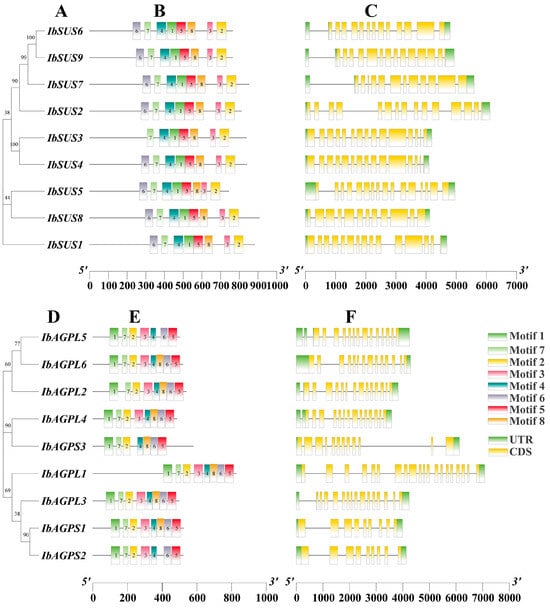 Phylogenetic relationship, conserved motifs, and gene structure analysis of IbSUSs and IbAGPases. (A,D) The phylogenetic trees of IbSUSs (A) and IbAGPases (D) were constructed using MEGA 11; (B,E) motif distribution of the IbSUS (B) and IbAGPase (E) proteins. The conserved motifs of IbSUS and IbAGPase proteins were determined by MEME (http://meme-suite.org/tools/meme (accessed on 1 July 2023)) and visualized by TBtools v2.096. The motifs, numbered 1–8, are displayed in different colored boxes; (C,F) gene structures of IbSUSs (C) and IbAGPases (F). The yellow boxes and gray lines represent exons and introns, respectively.