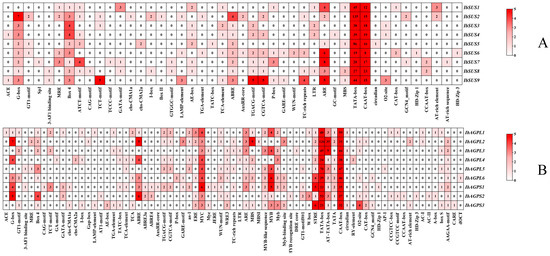 Cis-acting element analysis in the promoters of IbSUSs (A) and IbAGPases (B).