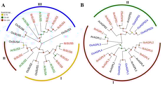 Phylogenetic analysis of SUSs (A) and AGPases (B) in sweet potato, Arabidopsis thaliana, and Oryza sativa. (A) Based on the evolutionary distance, a total of 21 SUSs were divided into three groups (Groups I, II, and III, with orange, dark red, and blue, respectively). The red color represents nine IbSUSs in sweet potato. The green represents six AtSUSs in Arabidopsis thaliana. The black represents six OsSUSs in Oryza sativa. (B) A total of 22 AGPases were divided into two groups (Groups I and II, with dark red and green, respectively). The red color represents nine IbAGPases in sweet potato. The black represents six AtAGPases in Arabidopsis thaliana. The blue represents seven OsAGPases in Oryza sativa.