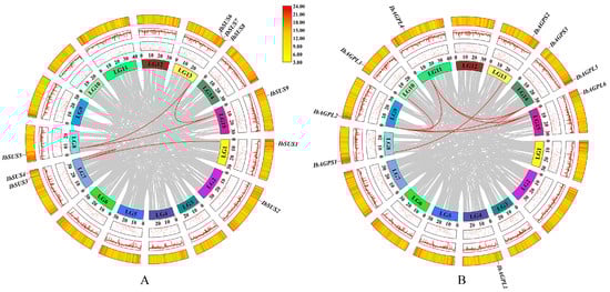 Schematic representations of the chromosomal distribution and interchromosomal relationships among sweet potato SUS (A) and AGPase (B) genes. Chromosomes are represented in different colors. Red lines between IbSUS (A) or IbAGPase (B) genes represent segmental duplication events that occurred in the sweet potato SUS (A) and AGPase (B) gene families.