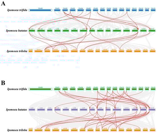 Synteny analyses of SUS (A) and AGPase (B) genes between sweet potato and other representative plant species (Ipomoea trifida and Ipomoea triloba). Gray lines indicate significantly collinear blocks within and among plant genomes. Red lines indicate significantly collinear blocks within and among plant genomes between SUS (A) and AGPase (B) genes. The red triangles represent the position of IbSUS (A) and IbAGPase (B) genes on the chromosome of sweet potato.