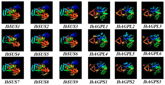 Our analysis of secondary structures revealed that IbSUSs predominantly exhibit α-helix (48.99% to 53.35%) and random coil (26.61% to 32.50%), while IbAGPases mostly consist of random coil (49.09% to 61.20%) and α-helix (19.96% to 35.91%) (Table 3). Predictions of tertiary structure indicated that the proteins of the SUS and AGPase families in sweet potato show a high degree of structural similarity (Figure 8). The specific structural features identified are closely related to their functional roles, suggesting that the unique structural domains are essential for the functions of the IbSUS and IbAGPase gene families.