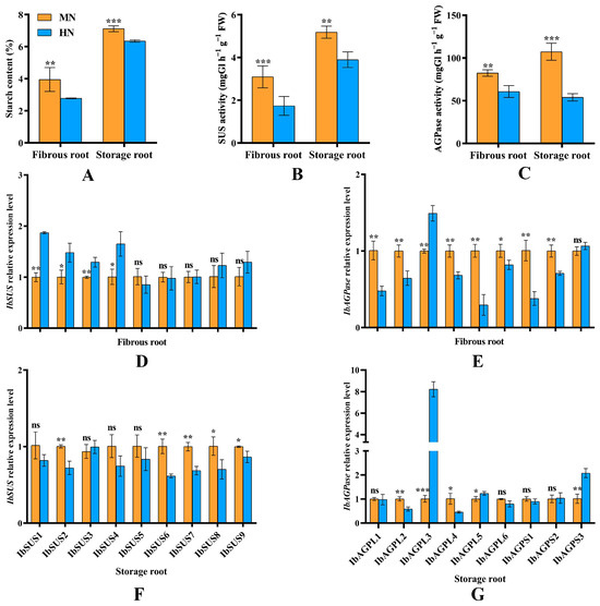 (A) Starch content in fibrous root and storage root in sweet potato; (B,C) SUS and AGPase activity in fibrous root and storage root in sweet potato; (D–G) relative expression levels of IbSUS and IbAGPase genes in response to excessive nitrogen stress. MN, 120 kg ha−1 N; EN, 180 kg ha−1 N. *: p < 0.05; **: p < 0.01; ***: p < 0.001; ns: not significant. Error bars indicate the standard derivations.