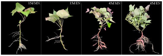 Plant samples were collected at two time points: at 15 and 45 d after planting. For each plant, we mixed the fibrous roots at 15 d and storage roots at 45 d and cut them into 1 cm pieces, separately, then immediately froze them in liquid nitrogen and stored them at −80 °C for subsequent enzymatic activity assays and qRT-PCR analysis. At 15 d and 45 d, we selected five plants to sterilize at 105 °C and dried them at 60 °C. The dried samples were ground to a fine powder for starch content determination. Roots with diameters smaller than 0.2 cm were categorized as fibrous roots, while those exceeding 0.5 cm in diameter were classified as storage roots. The counts of fibrous roots at 15 d and storage roots at 45 d per plant were analyzed for differences between MN and EN treatments.