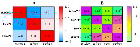 Correlation analysis between IbAGPL3 gene expression level and agronomic traits. (A) Correlation analysis between IbAGPL3 gene expression level in fibrous root and fibrous root number per plant (FRNPP), fibrous root weight per plant (FRWPP). Red represents positive correlation, and light blue represents negative correlation. (B) Correlation analysis between IbAGPL3 gene expression level in storage root and storage root number per plant (SRNPP), storage root weight (SRW), storage root weight per plant (SRWPP). Purple represents positive correlation, and light green represents negative correlation. *: p < 0.05; **: p < 0.01.