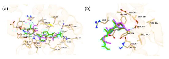 (a) The redocked calcitriol (pink) and native co-crystalized structure of calcitriol (green) (PDB ID: 1IE9); The blue dotted lines are the hydrogen bonds. (b) The redocked lithocholic acid (pink) and native co-crystalline structure of lithocholic acid (green) are displayed (PDB ID: 4Q0A). The blue dotted lines are the hydrogen bonds.