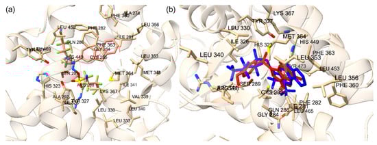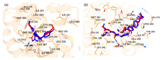 (a) The co-crystal structure of PPARy (PBD ID: 3ET3) and docked binding pose of the PFAS compound (DTXSID201033555) in the orthosteric binding site with the second-lowest docking score (−12.1). Amino acid residues within 5 Å of the co-crystal structure are shown in stick form. (b) The superimposed co-crystal structure of PPARy with ET1 in red (PDB ID: 3ET3) and the docked binding pose of the PFAS compound (DTXSID201033555) in blue bound to the orthosteric binding site with a docking score of −12.1. Amino acid residues within 5 Å of the co-crystal structure are shown in stick form.