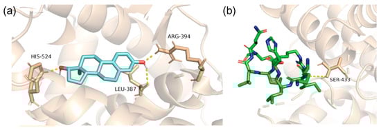 (a) The redocked estradiol is displayed at the orthosteric site. (b) The redocked SRC-1 is displayed at the allosteric site. The yellow dotted lines are the hydrogen bonds. The amino acid residues involved with hydrogen bonding are displayed.
