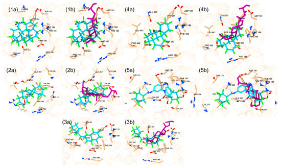 (1a) The top PFAS chemical (blue) ranked by the docking score at the orthosteric site is displayed, Perfluoroperhydrobenzyl tetralin, under the classification of Polycyclic Perfluoroalkane. (1b) Perfluoroperhydrobenzyl tetralin and the redocked calcitriol (purple) are displayed. (2a) The second top PFAS chemical (blue) by docking score at the orthosteric site is displayed, DTXSID60881337, under the classification of Polycyclic Perfluoroalkane. (2b) DTXSID60881337 and the redocked calcitriol (purple) are displayed. (3a) The third top PFAS chemical (blue) by docking score at the orthosteric site is displayed, DTXSID101023399, under the classification of Cyclic Perfluoroalkane. (3b) DTXSID101023399 and the redocked calcitriol (purple) are displayed. (4a) The fourth top PFAS chemical (blue) by docking score at the orthosteric site is displayed, DTXSID701036930, under the classification of Perfluoroalkyl Sulfonic Acids. (4b) DTXSID701036930 and the redocked calcitriol (purple) are displayed. (5a) The fourth top PFAS chemical (blue) by docking score at the orthosteric site is displayed, Hexatetracontafluorodocosane, under the classification of Perfluoroalkane. (5b) Hexatetracontafluorodocosane and the redocked calcitriol (purple) are displayed. The hydrogen bonds are displayed.