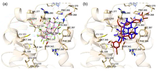 Docking experiments with various native ligands of PXR were performed on the orthosteric and allosteric AF-2 site to evaluate the accuracy of the docking protocol. The binding affinities of these native ligands were compared with those of external receptor ligands (Table S2). Vitamin K2 displayed the highest binding affinity of −9.7 kcal/mol among PXR native ligands at the orthosteric LBD site and Lovastatin displayed the highest binding affinity of −5.6 kcal/mol at the allosteric AF-2 site. Importantly, all of PXR’s native ligands exhibited superior binding affinities to the orthosteric site compared to the native ligands collected from external receptors, with the exception of PXR’s native ligand Schisandrin A. However, literature studies have shown that this compound activates human PXR with a similar efficacy and potency as rifampicin, which is known to be a relatively weak PXR binder [27,28]. Similarly, at the AF-2 site, most of PXR’s native ligands displayed higher binding affinities to the allosteric binding site compared to the native ligands collected from external receptors, with the exception of 5-beta-pregnane-3-20-dione and 3-keto-lithocholic acid. However, these ligands had binding affinity values of −4.6 kcal/mol, relatively close to the native ligand with the highest binding affinity that belonged to an external receptor, which was −4.7 kcal/mol. This minor difference could stem from the larger size and intricacy of the former ligands, making their precise docking at the allosteric site more challenging. Given the remarkably close resemblance of these outlier values to the optimal binding affinity of an external receptor’s native ligand, the docking methodology employed evidently retains its accuracy.