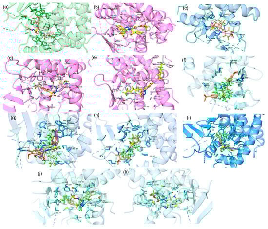 The 11 highest-binding-affinity PFAS superimposed conformations at the orthosteric site of the PXR are displayed along with the reference ligand, 4WH. (a) DTXSID501041016 (salmon) with a docking score of −13.5. (b) DTXSID401026885 (yellow) with a docking score of −13.1. (c) DTXSID60881337 (salmon) with a docking score of −12.6. (d) DTXSID701026989 (salmon) with a docking score of −12.4. (e) DTXSID70896735 (yellow) with a docking score of −12.1. (f) DTXSID10896198 (green) with a docking score of −12.1. (g) DTXSID90984683 (salmon)with a docking score of −12. (h) DTXSID70597457 (green) with a docking score of −12. (i) DTXSID801026875 (green) with a docking score of −12. (j) DTXSID60896264 (green)with a docking score of −12. (k) DTXSID40881335 (beige) with a docking score of −12. Amino acid residues within a distance of 5 Å are labeled.