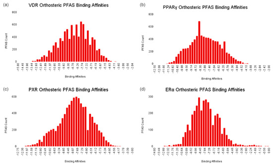 The distributions of PFAS binding affinities measured in kcal/mol are displayed at the orthosteric site of (a) PXR, (b) PPARγ, (c) ERα, and (d) VDR.