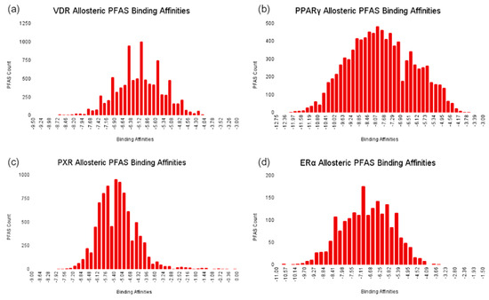 The distributions of PFAS binding affinities measured in kcal/mol are displayed at the allosteric site of (a) PXR, (b) PPARγ, (c) ERα, and (d) VDR.