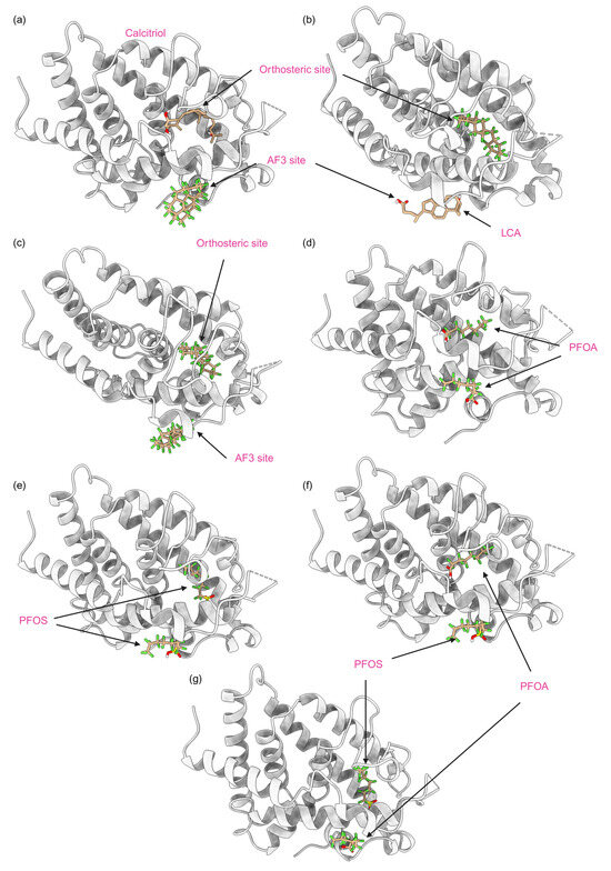 In this study, we report only the results of the simultaneous binding of non-native ligands, i.e., PFAS and native ligands binding to the VDR. Figure 13 visualizes various mixed models with seven significant combinations of PFAS and endogenous or native ligands, each influencing the activation or altered function of the VDR. PFAS may have toxic effects when bound simultaneously to the allosteric site in combination with the calcitriol at the orthosteric site, potentially causing an overactivation of the VDR as shown in Figure 13a). In this model, lithocholic acid (LCA) can be substituted by the PFAS DTXSID70597457 (Fluoropolymer—FP) at the allosteric site, while the orthosteric site remains occupied by calcitriol. This mode of receptor activation requires PFAS binding to the allosteric site, which, due to its lower binding affinity and more superficial location compared to the orthosteric site, is more accessible, allowing various PFAS to bind and potentially cause receptor overactivation. The combination of PFAS at the allosteric site with calcitriol at the orthosteric site may pose a potential hazard, as the PFAS stabilizes the VDR while calcitriol performs its native function, potentially resulting in an overactivated VDR complex. For example, as shown in Figure 13, panel b, LCA binds to the allosteric site while a high-energy binding PFAS, DTXSID40881335 (Fluoropolymer—FP), occupies the orthosteric site. These combinations are common due to the hydrophobic nature of PFAS and the abundance of endogenous ligands such as calcitriol and LCA. Consequently, one endogenous ligand will bind to the receptor while the other site is occupied by a PFAS, leading to the overactivation of the VDR. In scenarios of high PFAS exposure, two PFAS molecules could bind to both the orthosteric and allosteric sites, as illustrated in Figure 13, panel c, with two high-affinity binding PFAS, including DTXSID40881335 at the orthosteric site and DTXSID70597457 at the allosteric site. Both PFAS molecules, consisting only of carbon–fluorine rings and chains, enhance the hydrophobic interaction, which is highly carcinogenic due to the non-endogenous nature of these chemicals, resulting in significant protein stabilization and super-activation. Particularly concerning are PFAS commonly found in humans, such as perfluorooctanoic acid (PFOA) and perfluorooctane sulfonate (PFOS), which are often found at high concentrations. As depicted in Figure 13, panels d through g, PFAS chemicals can occupy both the orthosteric and allosteric sites of the VDR, leading to overactivation that could lead to carcinogenesis. This is significant given the prevalent rates of PFOA and PFOS in humans, which could lead to VDR overactivation and potential cancer risks.