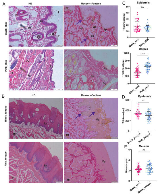 Figure 1. Morphological and melanin deposition characteristics of skin and tongue of sheep. (A) The skin stained with HE and Masson–Fontana stains. (B) The tongue stained with HE and Masson–Fontana stains. Scale bars: 100 μm. Ep: epidermal layer, De: dermal layer, Hf: hair follicle, Sg: sebaceous gland, Ml: muscular layer. Purple arrow: melanin. (C) Statistical analysis of skin epidermis and dermis. (D) Statistical analysis of tongue epidermis. (E) Black skin and black tongue melanin diameter size. Section count: 15 fields of view per section were selected for counting (n = 5). In the figure: “ns” indicates no significant difference, “**” indicates p < 0.01, “****” indicates p < 0.0001.