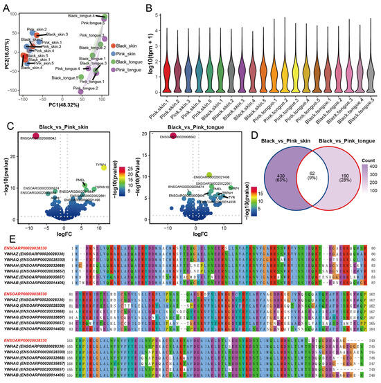 Figure 2. DEGs in skin and tongue between pink and black sheep. (A) PCA plot of 4 groups of samples. (B) Violin plot of gene expression in skin and tongue samples. (C) Volcanic map of DEGs in skin group and tongue group. (D) Venn diagram of DEGs in skin group and tongue group. (E) Amino acid sequence comparison between ENSOARG00020006042 and YWHAs family. Note: ENSOARP00020028330 is the protein ID of ENSOARG00020006042.