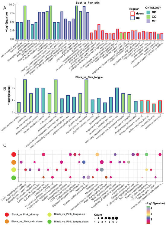 Figure 3. GO and KEGG enrichment analysis of DEGs associated with sheep pigmentation. (A) Top 20 GO enrichment terms for upregulated and downregulated genes in the skin. (B) Top 20 GO enrichment terms for upregulated and downregulated genes in the tongue. (C) Top 10 KEGG metabolic pathways for upregulated and downregulated genes in the skin and tongue tissues.