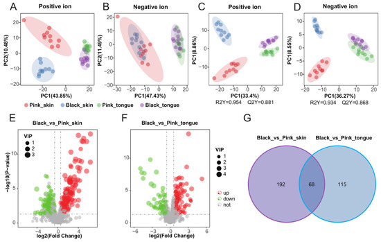 Figure 4. Pigmentation-related metabolomics of sheep skin and tongue. PCA maps of skin and tongue tissue samples in positive (A) and negative ion modes (B). PLS-da score plots for skin and tongue tissue samples in positive (C) and negative ion mode (D). Volcano plots of DEMs in the Black_vs_Pink_skin (E) and Black_vs_Pink_tongue (F) groups, respectively. (G) Venn diagram of DEMs in the Black_vs_Pink_skin and Black_vs_Pink_tongue groups.