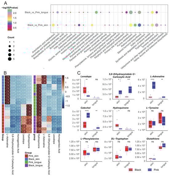 The KEGG analysis of the DEMs in the skin group revealed five significantly enriched metabolic pathways: retinol metabolism, tyrosine metabolism, nicotinate and nicotinamide metabolism, arachidonic acid metabolism, and purine metabolism. Additionally, DEMs in the tongue group were enriched in four significant KEGG pathways, including pantothenate and CoA biosynthesis, purine metabolism, ascorbate and aldarate metabolism, and tryptophan metabolism (Figure 5A). We further analyzed the expression patterns of metabolites enriched in the tyrosine metabolic pathway in the skin and tongue. The results showed that 5,6-dihydroxyindole-2-carboxylic Acid and L-adrenaline significantly differed in both the skin and tongue, whereas levodopa and hydroquinone only differed in the skin. In addition, we valued the levels of several melanin-related metabolites, including L-tyrosine, catechol, L-phenylalanine, DL-tryptophan, and glutathione, of which only catechol presented significant differences between the black and pink skin as well as the tongue (Figure 5B,C).