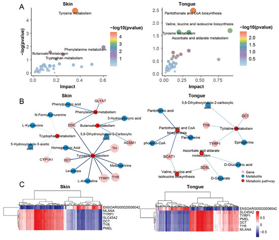 Figure 6. Integrative analysis for transcriptome and metabolome. (A) Joint pathway analysis of DEGs and DEMs in skin group and tongue group. (B) Network diagram of genes, metabolites, and metabolic pathways in the skin and tongue groups. (C) Heatmaps of genes and metabolites correlate in the skin group and tongue group.