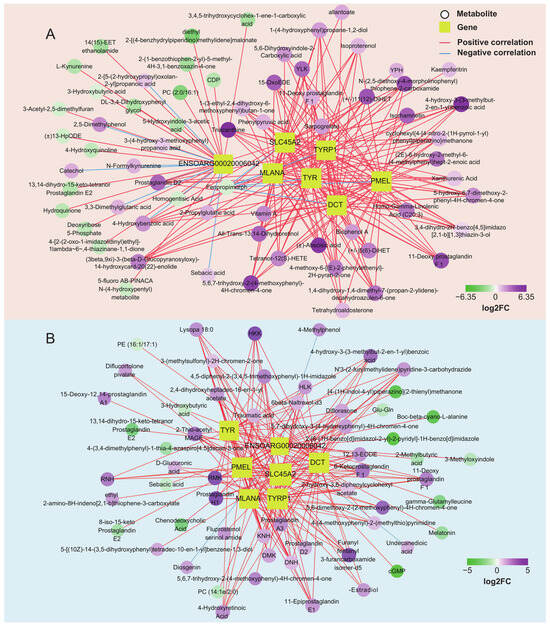 Figure 7. Network of pigmentation-associated genes and metabolites in the skin (A) and tongue group (B). (|r| > 0.75, p < 0.05).
