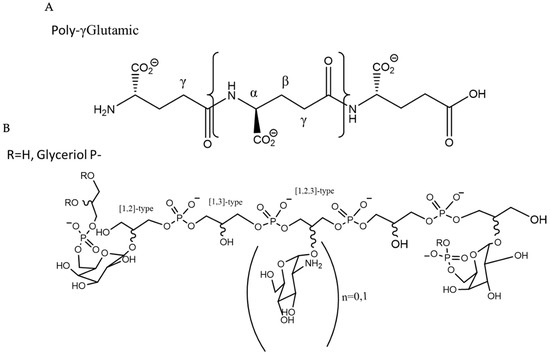 Structure of EPSp: (A) polyglutamic acid and (B) polyglycerol phosphate chain O-substituted with αGal moieties (αGal/αGlcNH2 3:1 molar ratio).